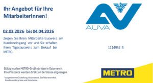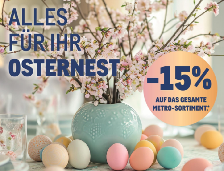 – 15 % auf das gesamte Sortiment bei Metro vom 02.03.-04.04.2026 Dieser Beitrag wurde am 25. Februar 2026 von Marion Wagner in Allgemein veröffentlicht.